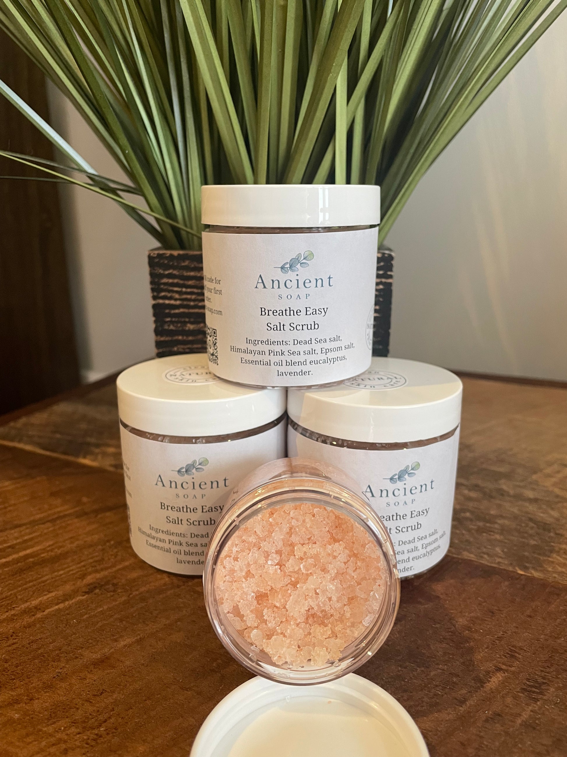 The Breathe Easy salt scrub is scented with Eucalyptus, lemon and lavender essential oils which helps to open up the airways while you shower.